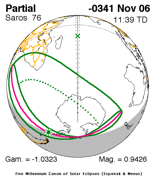 A partial eclipse of the Sun occurred on 6 November, 0342 BC UT Old Style, with maximum eclipse at 07:36 UT. This was a deep partial eclipse, with 94% of the Sun covered for viewers closest to the center. This provided a significant spectacle for those who saw it.