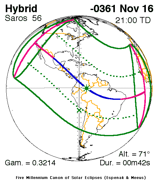A hybrid eclipse of the Sun occurred on 16 November, 0362 BC UT Old Style, with maximum eclipse at 16:52 UT. A fleeting hybrid eclipse covered a narrow path at most 26 km wide and lasted for 42 seconds at the point of maximum eclipse.