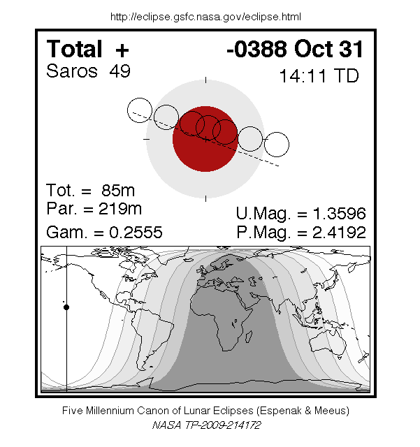 A total eclipse of the Moon occurred on 31 October, 0389 BC UT Old Style, with maximum eclipse at 09:56 UT. The Moon was plunged into darkness for 1 hour and 25 minutes, in a deep total eclipse which saw the Moon 36% of its diameter inside the Earth's umbral shadow. The visual effect of this depends on the state of the Earth's atmosphere, but the Moon may have been stained a deep red colour. The partial eclipse lasted for 3 hours and 39 minutes in total.