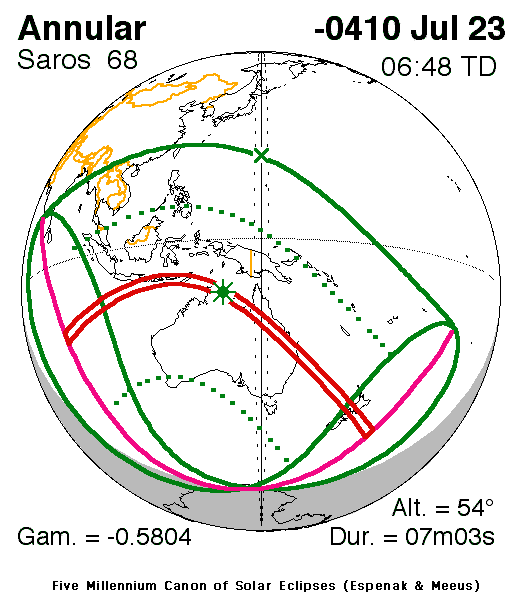 An annular eclipse of the Sun occurred on 23 July, 0411 BC UT Old Style, with maximum eclipse at 02:27 UT. The Sun was 95% covered in a moderate annular eclipse, lasting 7 minutes and 3 seconds and covering a very broad path, 243 km wide at maximum.