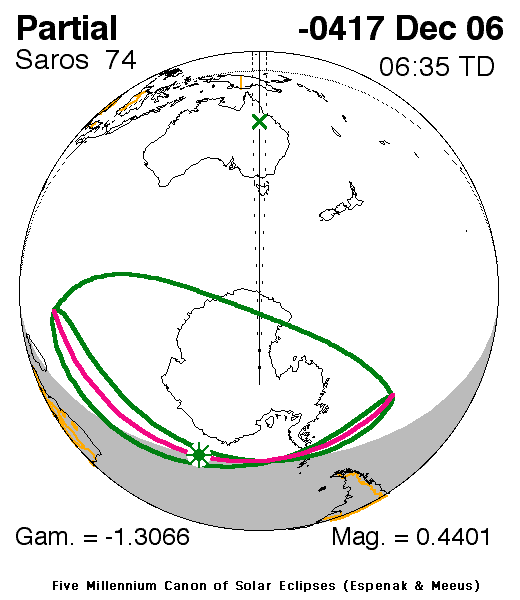 A partial eclipse of the Sun occurred on 6 December, 0418 BC UT Old Style, with maximum eclipse at 02:12 UT. A small partial eclipse barely darkened the Sun. With just 44% of the Sun covered for viewers closest to the center, this was of limited interest.