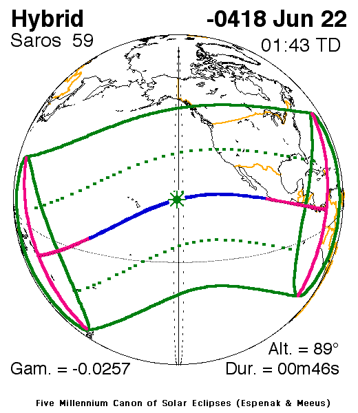 A hybrid eclipse of the Sun occurred on 21 June, 0419 BC UT Old Style, with maximum eclipse at 21:20 UT. The Sun was darkened for 46 seconds by a dramatic hybrid eclipse covering a narrow path at most 25 km wide. This was a sight worth seeing.