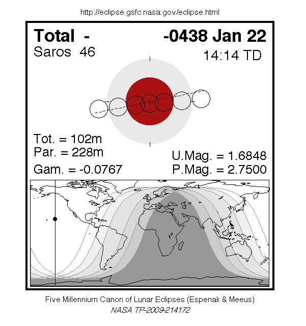 A total eclipse of the Moon occurred on 22 January, 0439 BC UT Old Style, with maximum eclipse at 09:46 UT. A dramatic total eclipse lasting 1 hour and 42 minutes plunged the full Moon into deep darkness, as it passed right through the centre of the Earth's umbral shadow. While the visual effect of a total eclipse is variable, the Moon may have been stained a deep orange or red colour at maximum eclipse. This was a great spectacle for everyone who saw it. The partial eclipse lasted for 3 hours and 49 minutes in total.