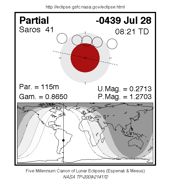 A partial eclipse of the Moon occurred on 28 July, 0440 BC UT Old Style, with maximum eclipse at 03:52 UT. The Earth's shadow on the moon was clearly visible in this eclipse, with 27% of the Moon in shadow; the partial eclipse lasted for 1 hour and 55 minutes.