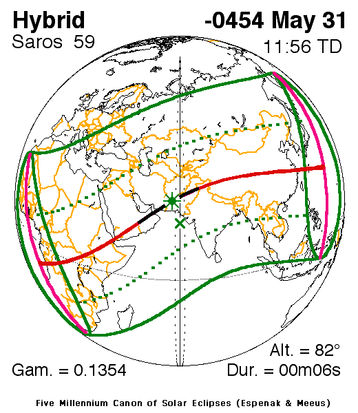 A hybrid eclipse of the Sun occurred on 31 May, 0455 BC UT Old Style, with maximum eclipse at 07:23 UT. A fleeting hybrid eclipse covered only a tiny path, just 3 km wide and lasted for a brief 6 seconds at the point of maximum eclipse.