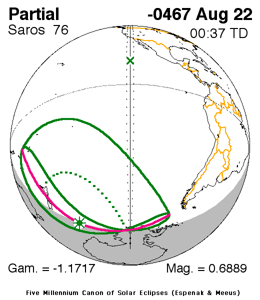 A partial eclipse of the Sun occurred on 21 August, 0468 BC UT Old Style, with maximum eclipse at 20:01 UT. A moderate partial eclipse, with 69% of the Sun covered for viewers closest to the center, created an interesting spectacle.