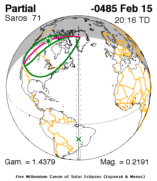 A partial eclipse of the Sun occurred on 15 February, 0486 BC UT Old Style, with maximum eclipse at 15:34 UT. A small partial eclipse barely darkened the Sun. With just 22% of the Sun covered for viewers closest to the center, this was of limited interest.