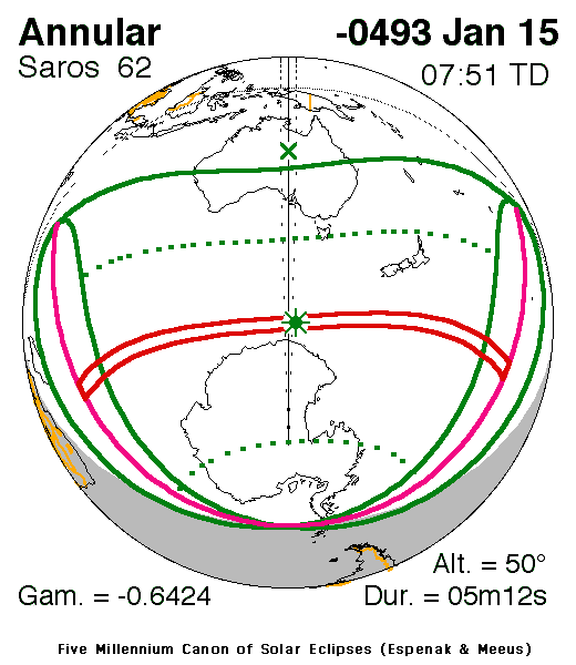 An annular eclipse of the Sun occurred on 15 January, 0494 BC UT Old Style, with maximum eclipse at 03:07 UT. The Sun was 94% covered in a moderate annular eclipse, lasting 5 minutes and 12 seconds and covering a very broad path, 288 km wide at maximum.