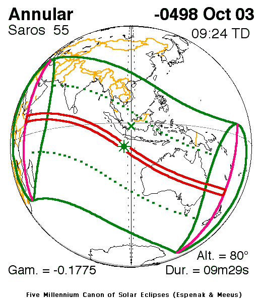 An annular eclipse of the Sun occurred on 3 October, 0499 BC UT Old Style, with maximum eclipse at 04:39 UT. A small annular eclipse covered only 93% of the Sun in a very broad path, 280 km wide at maximum, and lasted 9 minutes and 29 seconds.