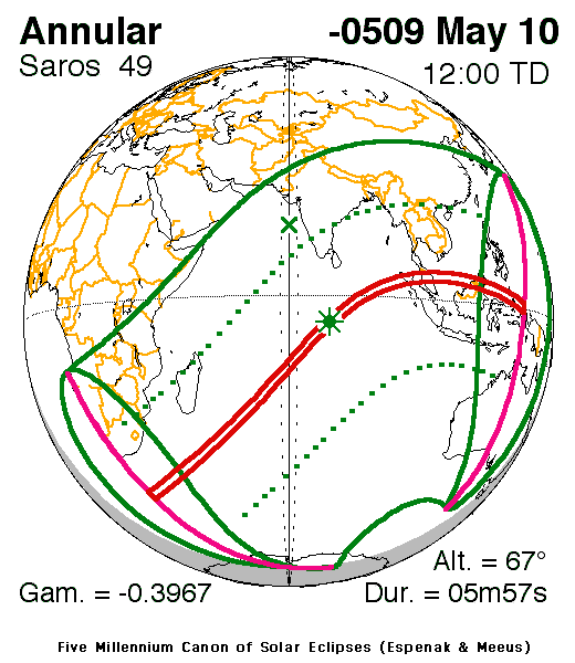 An annular eclipse of the Sun occurred on 10 May, 0510 BC UT Old Style, with maximum eclipse at 07:12 UT. The Sun was 95% covered in a moderate annular eclipse, lasting 5 minutes and 57 seconds and covering a broad path up to 194 km wide.