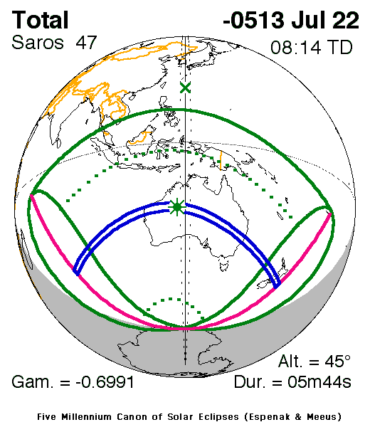 A total eclipse of the Sun occurred on 22 July, 0514 BC UT Old Style, with maximum eclipse at 03:25 UT. A dramatic total eclipse plunged the Sun into darkness for 5 minutes and 44 seconds at maximum, creating an amazing spectacle for observers in a very broad path, 289 km wide at maximum.