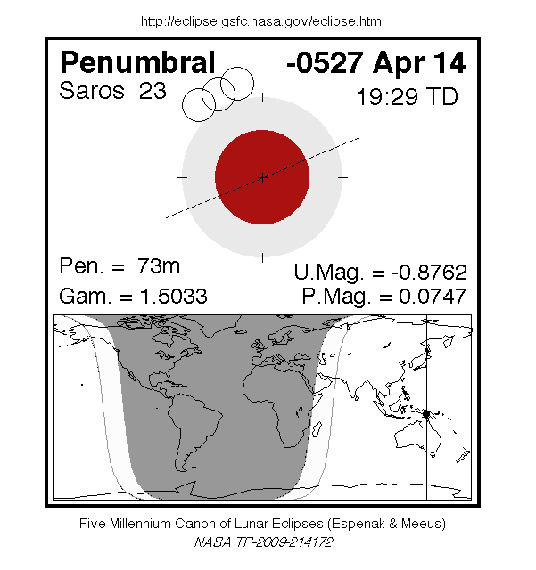 A penumbral eclipse of the Moon occurred on 14 April, 0528 BC UT Old Style, with maximum eclipse at 14:36 UT. In this extremely marginal eclipse, the Moon barely clipped the edge of the Earth's penumbral shadow. This caused a microscopic darkening of just 7% of the Moon's disc for 1 hour and 13 minutes, which was essentially impossible to see.