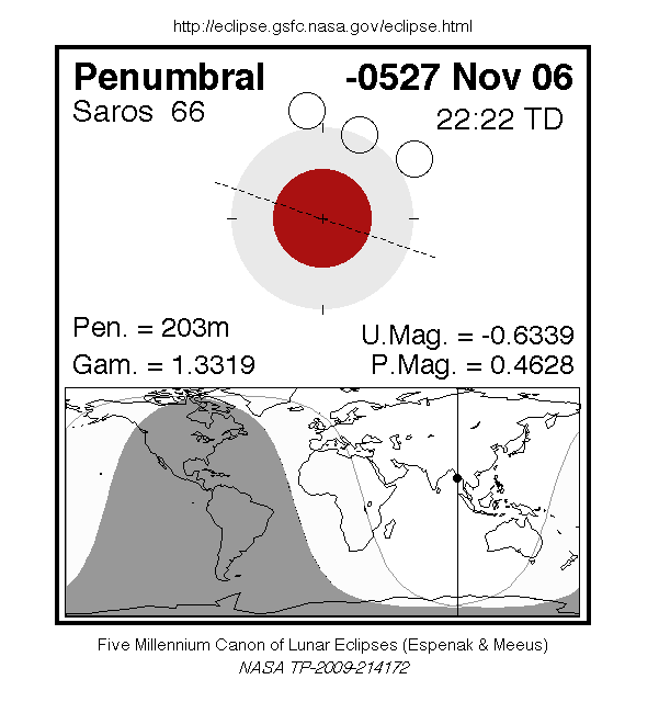 A penumbral eclipse of the Moon occurred on 6 November, 0528 BC UT Old Style, with maximum eclipse at 17:29 UT. This very subtle penumbral eclipse was essentially invisible to the naked eye; though it lasted 3 hours and 23 minutes, just 46% of the Moon's disc was in partial shadow (with no part of it in complete shadow).