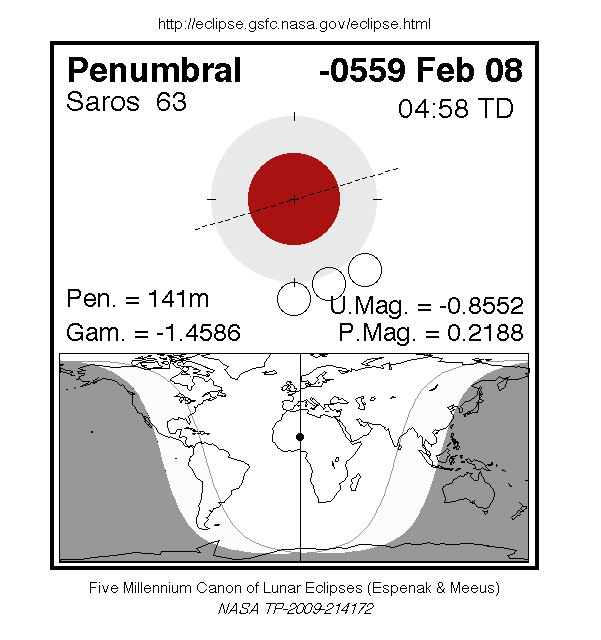 A penumbral eclipse of the Moon occurred on 7 February, 0560 BC UT Old Style, with maximum eclipse at 23:57 UT. This very subtle penumbral eclipse was essentially invisible to the naked eye; though it lasted 2 hours and 21 minutes, just 22% of the Moon's disc was in partial shadow (with no part of it in complete shadow).