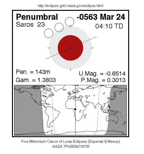 A penumbral eclipse of the Moon occurred on 23 March, 0564 BC UT Old Style, with maximum eclipse at 23:08 UT. This very subtle penumbral eclipse was essentially invisible to the naked eye; though it lasted 2 hours and 23 minutes, just 30% of the Moon's disc was in partial shadow (with no part of it in complete shadow).