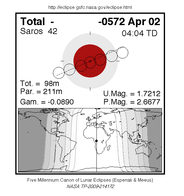 A total eclipse of the Moon occurred on 1 April, 0573 BC UT Old Style, with maximum eclipse at 23:00 UT. A dramatic total eclipse lasting 1 hour and 38 minutes plunged the full Moon into deep darkness, as it passed right through the centre of the Earth's umbral shadow. While the visual effect of a total eclipse is variable, the Moon may have been stained a deep orange or red colour at maximum eclipse. This was a great spectacle for everyone who saw it. The partial eclipse lasted for 3 hours and 31 minutes in total.