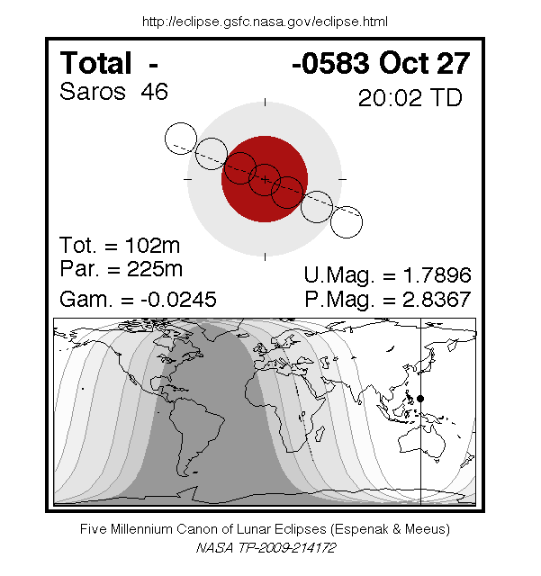 A total eclipse of the Moon occurred on 27 October, 0584 BC UT Old Style, with maximum eclipse at 14:55 UT. A dramatic total eclipse lasting 1 hour and 42 minutes plunged the full Moon into deep darkness, as it passed right through the centre of the Earth's umbral shadow. While the visual effect of a total eclipse is variable, the Moon may have been stained a deep orange or red colour at maximum eclipse. This was a great spectacle for everyone who saw it. The partial eclipse lasted for 3 hours and 45 minutes in total.