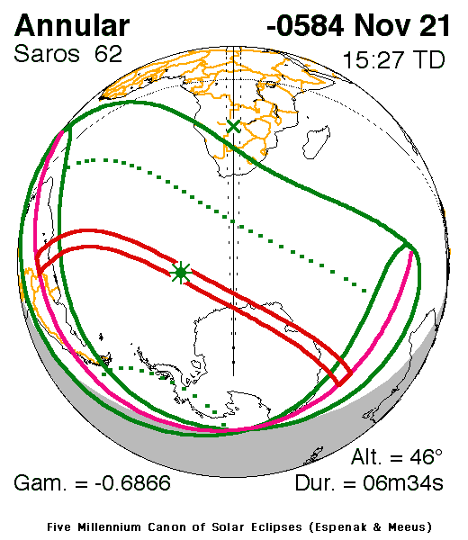 An annular eclipse of the Sun occurred on 21 November, 0585 BC UT Old Style, with maximum eclipse at 10:20 UT. A small annular eclipse covered only 92% of the Sun in a very broad path, 388 km wide at maximum, and lasted 6 minutes and 34 seconds.
