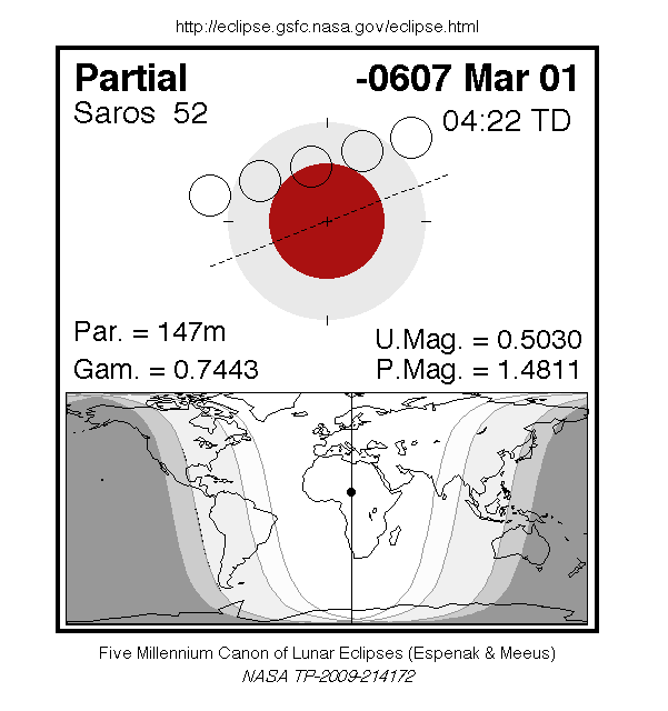 A partial eclipse of the Moon occurred on 28 February, 0608 BC UT Old Style, with maximum eclipse at 23:09 UT. The Earth's shadow on the moon was clearly visible in this eclipse, with 50% of the Moon in shadow; the partial eclipse lasted for 2 hours and 27 minutes.