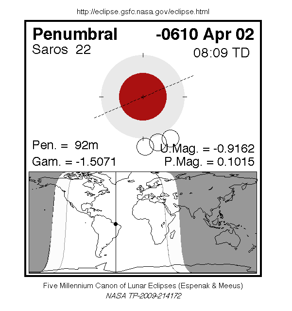 A penumbral eclipse of the Moon occurred on 2 April, 0611 BC UT Old Style, with maximum eclipse at 02:55 UT. In this extremely marginal eclipse, the Moon barely clipped the edge of the Earth's penumbral shadow. This caused a microscopic darkening of just 10% of the Moon's disc for 1 hour and 32 minutes, which was essentially impossible to see.