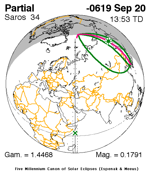 A partial eclipse of the Sun occurred on 20 September, 0620 BC UT Old Style, with maximum eclipse at 08:38 UT. With only 18% of the Sun covered at maximum eclipse, this was a very marginal eclipse at best, and rather uninteresting.