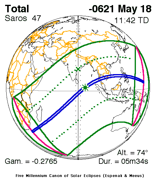 A total eclipse of the Sun occurred on 18 May, 0622 BC UT Old Style, with maximum eclipse at 06:26 UT. A dramatic total eclipse plunged the Sun into darkness for 5 minutes and 34 seconds at maximum, creating an amazing spectacle for observers in a broad path up to 209 km wide.