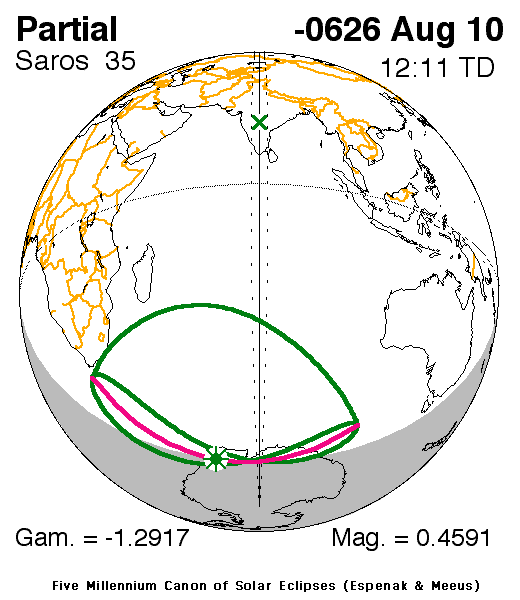 A partial eclipse of the Sun occurred on 10 August, 0627 BC UT Old Style, with maximum eclipse at 06:53 UT. A small partial eclipse barely darkened the Sun. With just 46% of the Sun covered for viewers closest to the center, this was of limited interest.