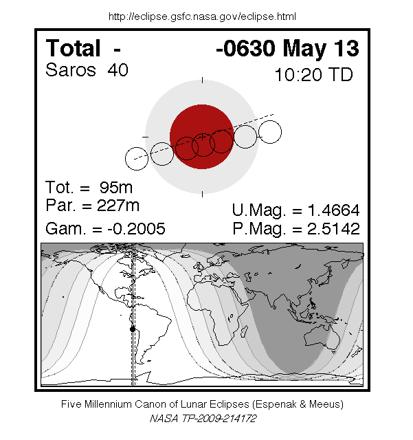 A total eclipse of the Moon occurred on 13 May, 0631 BC UT Old Style, with maximum eclipse at 05:01 UT. The Moon was plunged into darkness for 1 hour and 35 minutes, in a deep total eclipse which saw the Moon 47% of its diameter inside the Earth's umbral shadow. The visual effect of this depends on the state of the Earth's atmosphere, but the Moon may have been stained a deep red colour. The partial eclipse lasted for 3 hours and 47 minutes in total.