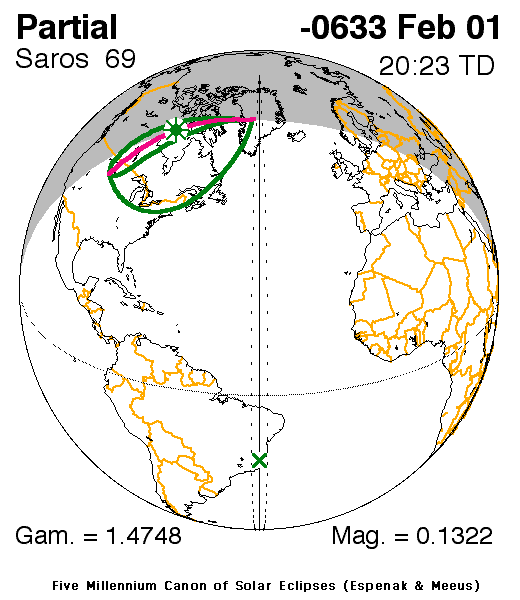 A partial eclipse of the Sun occurred on 1 February, 0634 BC UT Old Style, with maximum eclipse at 15:03 UT. With only 13% of the Sun covered at maximum eclipse, this was a very marginal eclipse at best, and rather uninteresting.