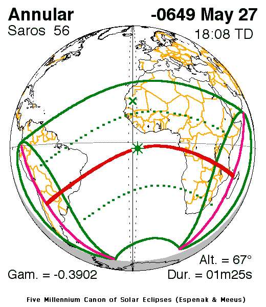 An annular eclipse of the Sun occurred on 27 May, 0650 BC UT Old Style, with maximum eclipse at 12:45 UT. A large annular eclipse covered 99% of the Sun, creating a dramatic spectacle for observers in a narrow path at most 44 km wide; it lasted 1 minute and 25 seconds at the point of maximum eclipse.