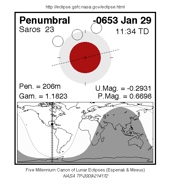 A penumbral eclipse of the Moon occurred on 29 January, 0654 BC UT Old Style, with maximum eclipse at 06:10 UT. This subtle penumbral eclipse may have been visible to a skilled observer at maximum eclipse. 67% of the Moon's disc was partially shaded by the Earth (none of it was in total shadow), which caused a gentle shadow gradient across its disc at maximum; the eclipse as a whole lasted 3 hours and 26 minutes.