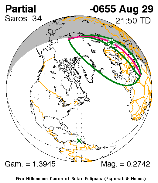 A partial eclipse of the Sun occurred on 29 August, 0656 BC UT Old Style, with maximum eclipse at 16:25 UT. A small partial eclipse barely darkened the Sun. With just 27% of the Sun covered for viewers closest to the center, this was of limited interest.