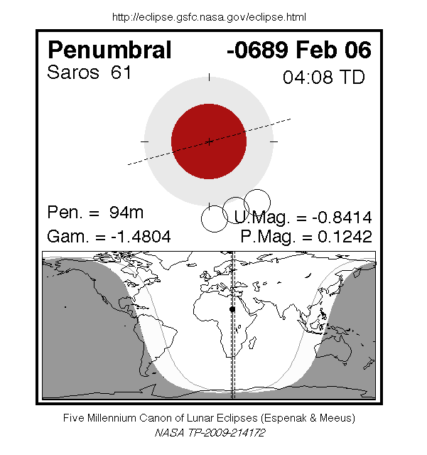 A penumbral eclipse of the Moon occurred on 5 February, 0690 BC UT Old Style, with maximum eclipse at 22:33 UT. In this extremely marginal eclipse, the Moon barely clipped the edge of the Earth's penumbral shadow. This caused a microscopic darkening of just 12% of the Moon's disc for 1 hour and 34 minutes, which was essentially impossible to see.