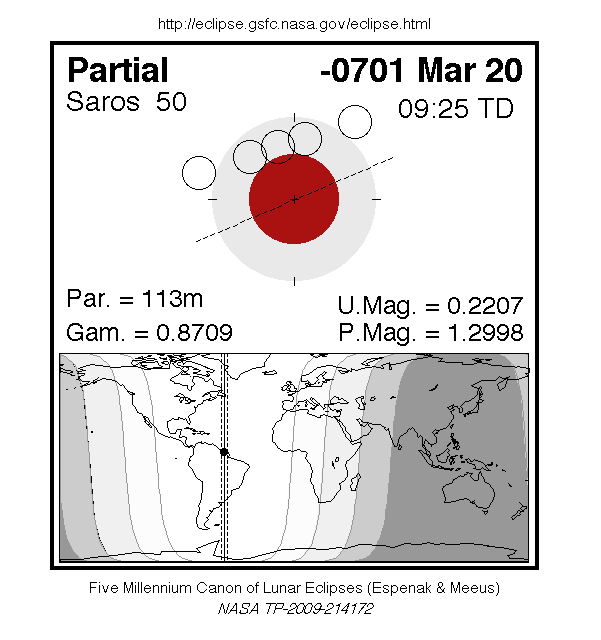 A partial eclipse of the Moon occurred on 20 March, 0702 BC UT Old Style, with maximum eclipse at 03:47 UT. The Earth's shadow on the moon was clearly visible in this eclipse, with 22% of the Moon in shadow; the partial eclipse lasted for 1 hour and 53 minutes.