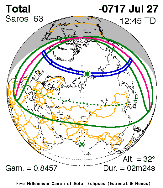A total eclipse of the Sun occurred on 27 July, 0718 BC UT Old Style, with maximum eclipse at 07:03 UT. A dramatic total eclipse plunged the Sun into darkness for 2 minutes and 24 seconds at maximum, creating an amazing spectacle for observers in a very broad path, 252 km wide at maximum.