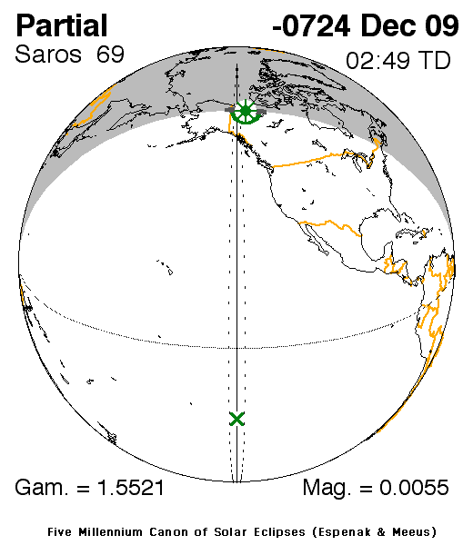 A partial eclipse of the Sun occurred on 8 December, 0725 BC UT Old Style, with maximum eclipse at 21:05 UT. With only 1% of the Sun covered at maximum eclipse, this was a very marginal eclipse at best, and rather uninteresting.