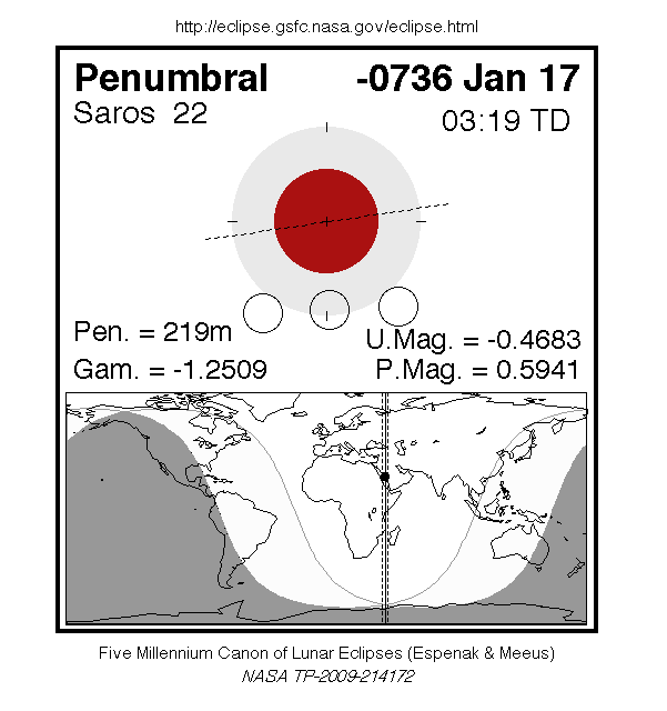 A penumbral eclipse of the Moon occurred on 16 January, 0737 BC UT Old Style, with maximum eclipse at 21:32 UT. This very subtle penumbral eclipse was essentially invisible to the naked eye; though it lasted 3 hours and 40 minutes, just 59% of the Moon's disc was in partial shadow (with no part of it in complete shadow).