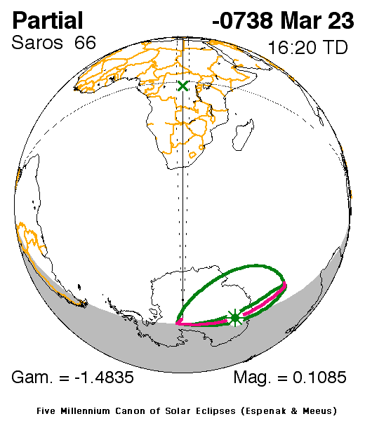 A partial eclipse of the Sun occurred on 23 March, 0739 BC UT Old Style, with maximum eclipse at 10:32 UT. With only 11% of the Sun covered at maximum eclipse, this was a very marginal eclipse at best, and rather uninteresting.