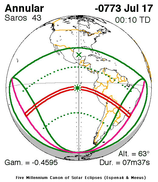 An annular eclipse of the Sun occurred on 16 July, 0774 BC UT Old Style, with maximum eclipse at 18:13 UT. The Sun was 95% covered in a moderate annular eclipse, lasting 7 minutes and 36 seconds and covering a broad path up to 224 km wide.