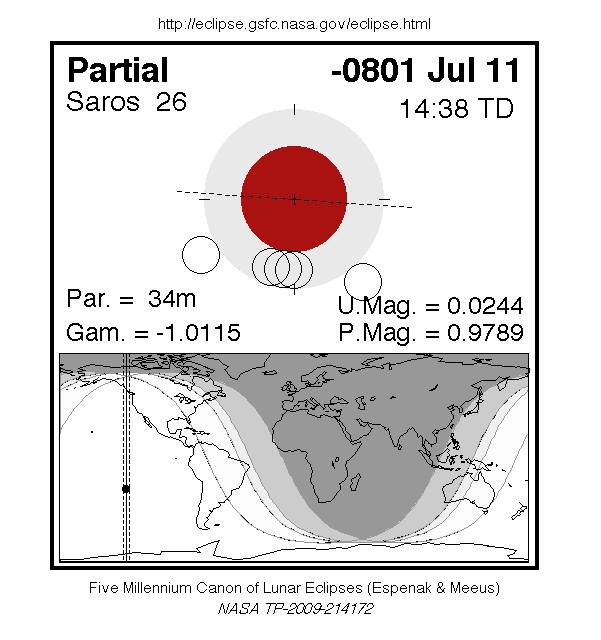 A partial eclipse of the Moon occurred on 11 July, 0802 BC UT Old Style, with maximum eclipse at 08:33 UT. A tiny bite out of the Moon may have been visible at maximum, though just 2% of the Moon was shadowed in a partial eclipse which lasted for 34 minutes and 18 seconds. A shading across the moon from the Earth's penumbral shadow should have been visible at maximum eclipse.