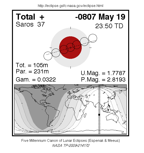 A total eclipse of the Moon occurred on 19 May, 0808 BC UT Old Style, with maximum eclipse at 17:44 UT. A dramatic total eclipse lasting 1 hour and 45 minutes plunged the full Moon into deep darkness, as it passed right through the centre of the Earth's umbral shadow. While the visual effect of a total eclipse is variable, the Moon may have been stained a deep orange or red colour at maximum eclipse. This was a great spectacle for everyone who saw it. The partial eclipse lasted for 3 hours and 51 minutes in total.