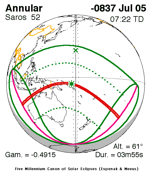 An annular eclipse of the Sun occurred on 5 July, 0838 BC UT Old Style, with maximum eclipse at 01:07 UT. The Sun was 97% covered in a moderate annular eclipse, lasting 3 minutes and 55 seconds and covering a path up to 126 km wide.
