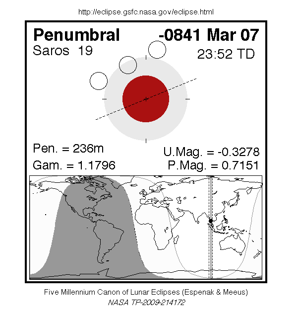 A penumbral eclipse of the Moon occurred on 7 March, 0842 BC UT Old Style, with maximum eclipse at 17:36 UT. This subtle penumbral eclipse may have been visible to a skilled observer at maximum eclipse. 72% of the Moon's disc was partially shaded by the Earth (none of it was in total shadow), which caused a gentle shadow gradient across its disc at maximum; the eclipse as a whole lasted 3 hours and 56 minutes.