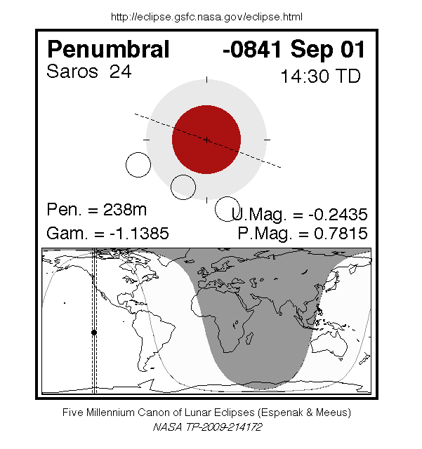 A penumbral eclipse of the Moon occurred on 1 September, 0842 BC UT Old Style, with maximum eclipse at 08:14 UT. This subtle penumbral eclipse may have been visible to a skilled observer at maximum eclipse. 78% of the Moon's disc was partially shaded by the Earth (none of it was in total shadow), which caused a gentle shadow gradient across its disc at maximum; the eclipse as a whole lasted 3 hours and 58 minutes.