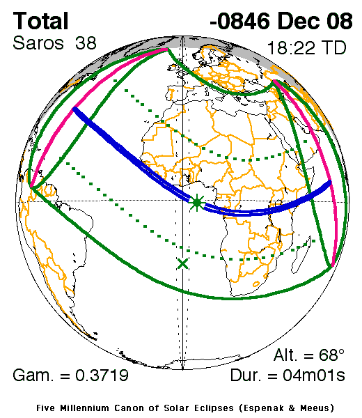 A total eclipse of the Sun occurred on 8 December, 0847 BC UT Old Style, with maximum eclipse at 12:05 UT. A dramatic total eclipse plunged the Sun into darkness for 4 minutes and 1 second at maximum, creating an amazing spectacle for observers in a path up to 152 km wide.