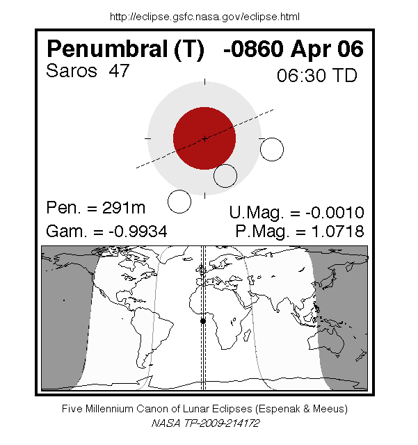 A penumbral eclipse of the Moon occurred on 6 April, 0861 BC UT Old Style, with maximum eclipse at 00:08 UT. In a rare total penumbral eclipse, the entire Moon was partially shaded by the Earth (though none of it was in complete shadow), and the shading across the Moon should have been quite visible at maximum eclipse. The penumbral phase lasted for 4 hours and 51 minutes in all, though for most of it, the eclipse was extremely difficult or impossible to see.