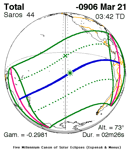 A total eclipse of the Sun occurred on 20 March, 0907 BC UT Old Style, with maximum eclipse at 21:07 UT. A dramatic total eclipse plunged the Sun into darkness for 2 minutes and 26 seconds at maximum, creating an amazing spectacle for observers in a path up to 90 km wide.