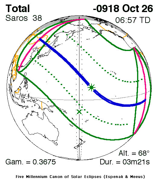 A total eclipse of the Sun occurred on 26 October, 0919 BC UT Old Style, with maximum eclipse at 00:19 UT. A dramatic total eclipse plunged the Sun into darkness for 3 minutes and 21 seconds at maximum, creating an amazing spectacle for observers in a path up to 139 km wide.