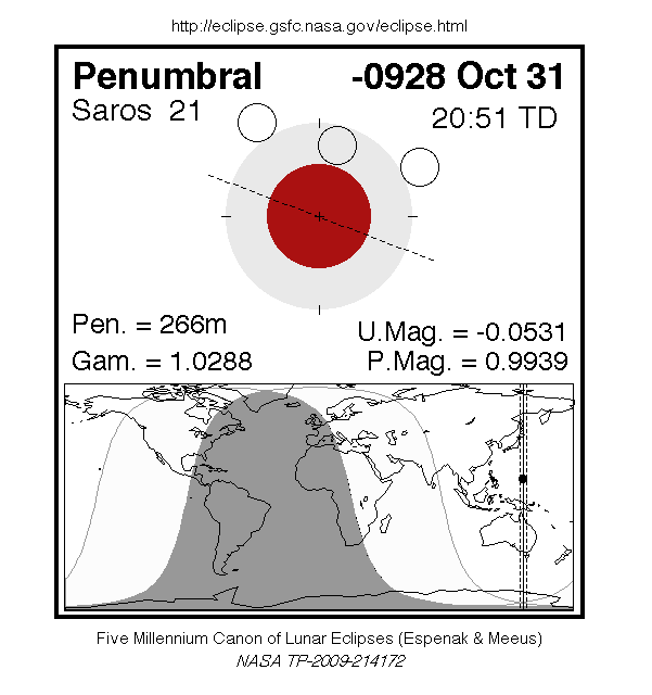 A penumbral eclipse of the Moon occurred on 31 October, 0929 BC UT Old Style, with maximum eclipse at 14:10 UT. At maximum eclipse, 99% of the Moon's disc was partially shaded by the Earth, which caused a slight shadow gradient across its disc; this subtle effect may have been visible to careful observers. No part of the Moon was in complete shadow. The eclipse lasted 4 hours and 26 minutes overall.