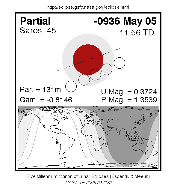 A partial eclipse of the Moon occurred on 5 May, 0937 BC UT Old Style, with maximum eclipse at 05:12 UT. The Earth's shadow on the moon was clearly visible in this eclipse, with 37% of the Moon in shadow; the partial eclipse lasted for 2 hours and 12 minutes.